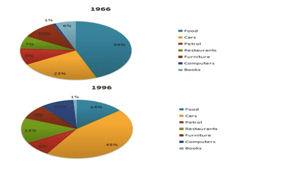Academic Writing Task 1 Sample 2 – The given pie charts compare the expenses in 7 different categories in 1966 and 1996 by American Citizens. Summarise the information by selecting and reporting the main features, and make comparisons where relevant.