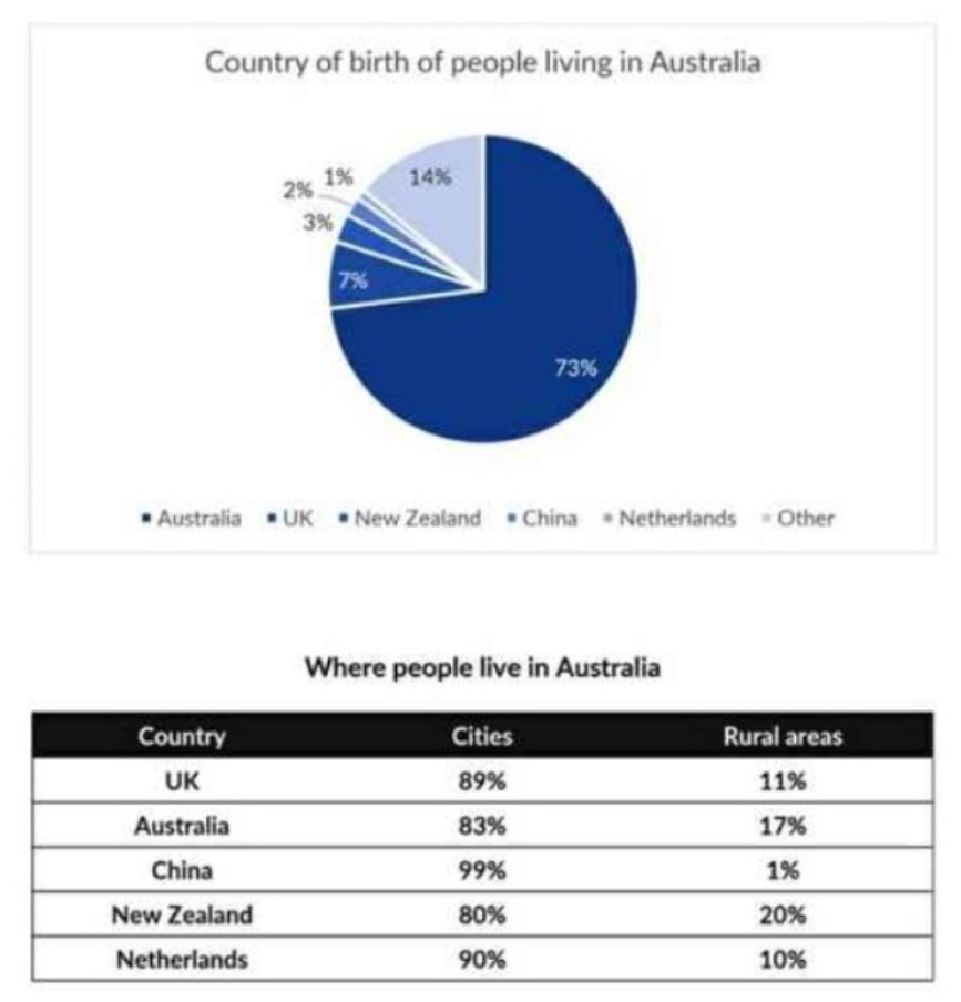 The provided pie charts demonstrate the percentage of living people original birth time country. At the same time, the table reveals that these people living area is divided into two categories: cities and rural areas. Overall, the majority of proportion is Australian and least of Netherlands country. Moreover, in urban areas, people percentage is higher than in the rural side in all 5 given countries.