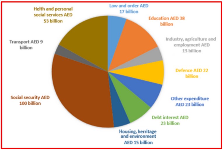 It was commencing at hundred billion AED which was the highest amount spent on social security, while the lowest amount utilised on transport that was 9 billion AED. Interestingly, about 23 billion of United Arab Emirates dirham were disbursed on defence, debit interest, and other expenditures.