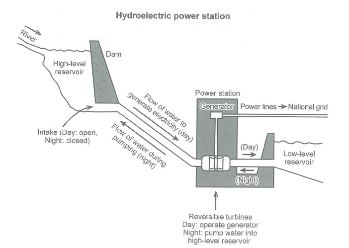 From the given diagram, the river water is stored in the high-level reservoir under the dam. Whilst the dam gates open during the daytime, then the water flow passes from the pipes to the power station. Moreover, the power station consists of reversible turbines, which operate the generator. In the long run, the generator provides the electricity with the power lines which pass to the national grid.