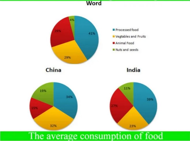 The pie chart illustrates the average amount of food consumed by the world in comparison to India and China in the year 2008. Summarise the information by selecting and reporting the main features.